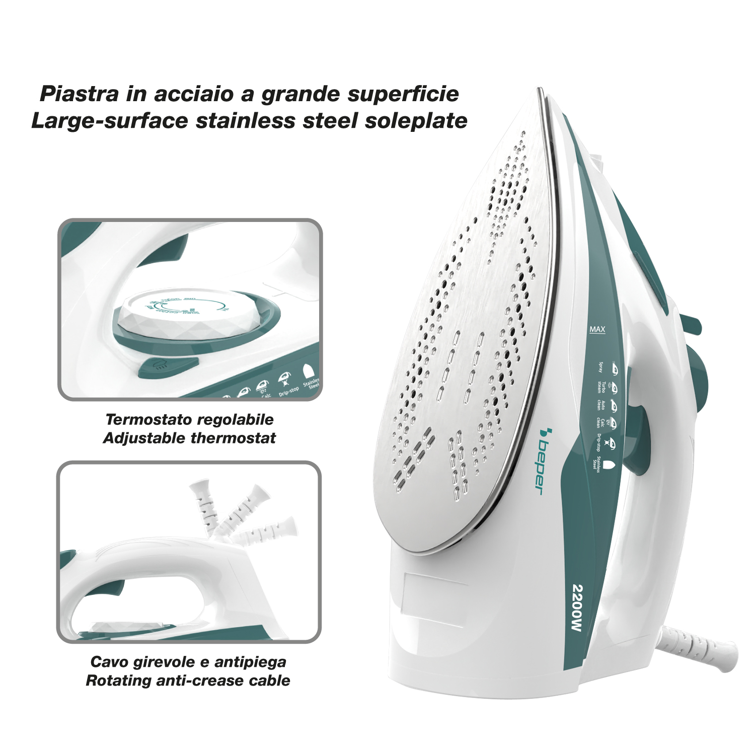 • PIASTRA ACCIAIO DI GRANDE SUPERFICIE PER STIRATURA RAPIDA: Il ferro da stiro Beper SteamPro 300 si riscalda velocemente e scivola con facilità su ogni tessuto.