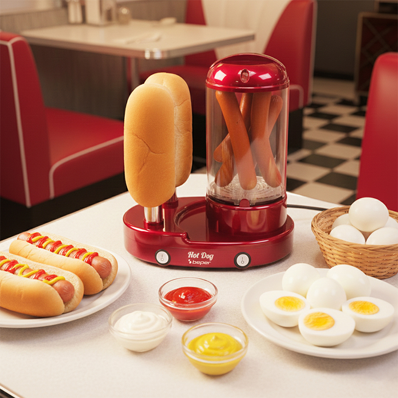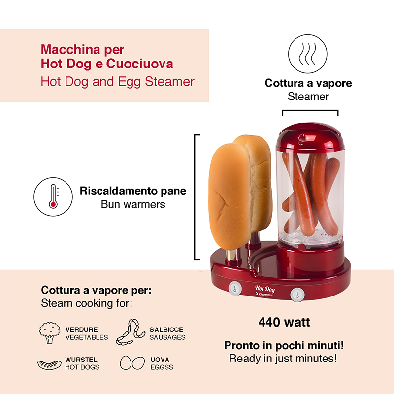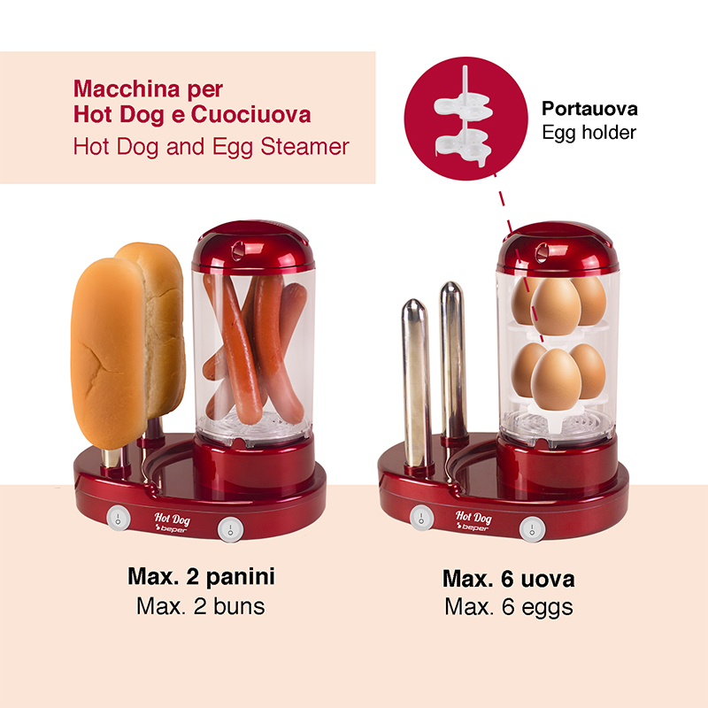 - MACCHINA PER HOT DOG 3 IN 1 MULTIFUNZIONE: Cuoci a vapore wurstel, salsicce e verdure, prepara fino a 6 uova e scalda 2 panini contemporaneamente con un solo dispositivo compatto.