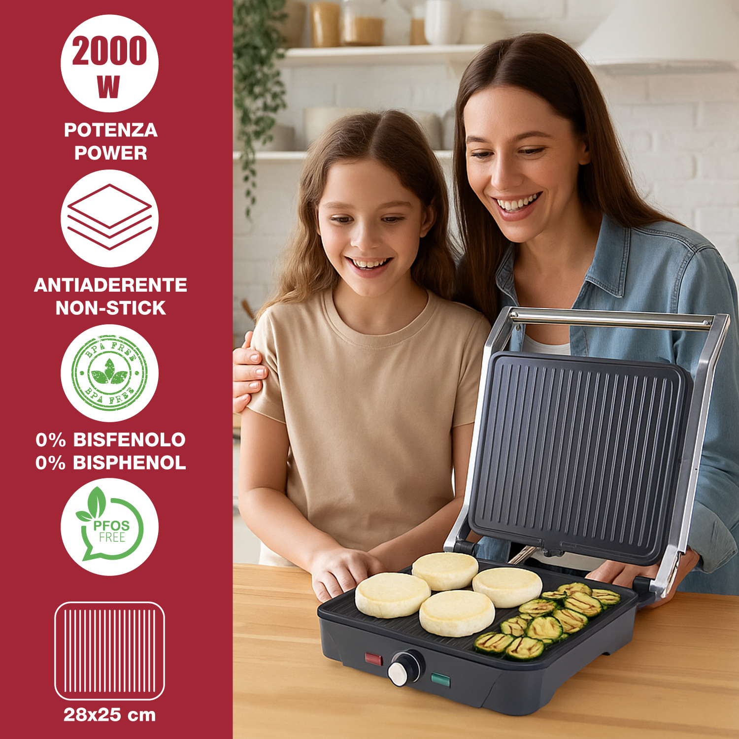 - ROBUSTA, SICURA E FACILE DA PULIRE: Struttura rinforzata, maniglia fredda, spie luminose e vassoio raccogli-grassi lavabile rendono Beper Grand Grill comoda e sicura ogni giorno.