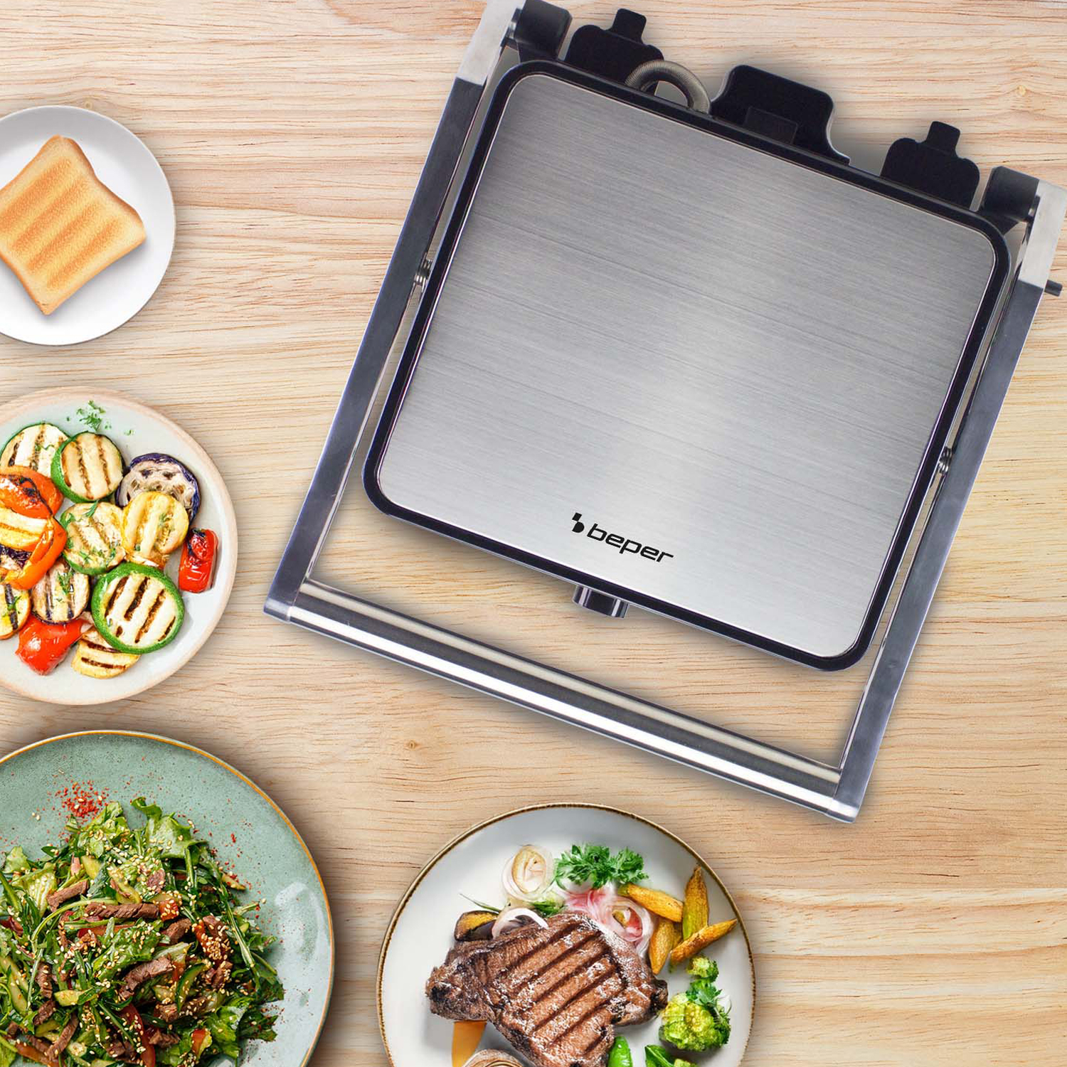 - 3 FUNZIONI IN 1: BISTECCHIERA, PIASTRA E GRIGLIA BBQ: Con Beper Grand Grill puoi grigliare carne, tostare panini e cucinare come al barbecue, tutto in un solo apparecchio.