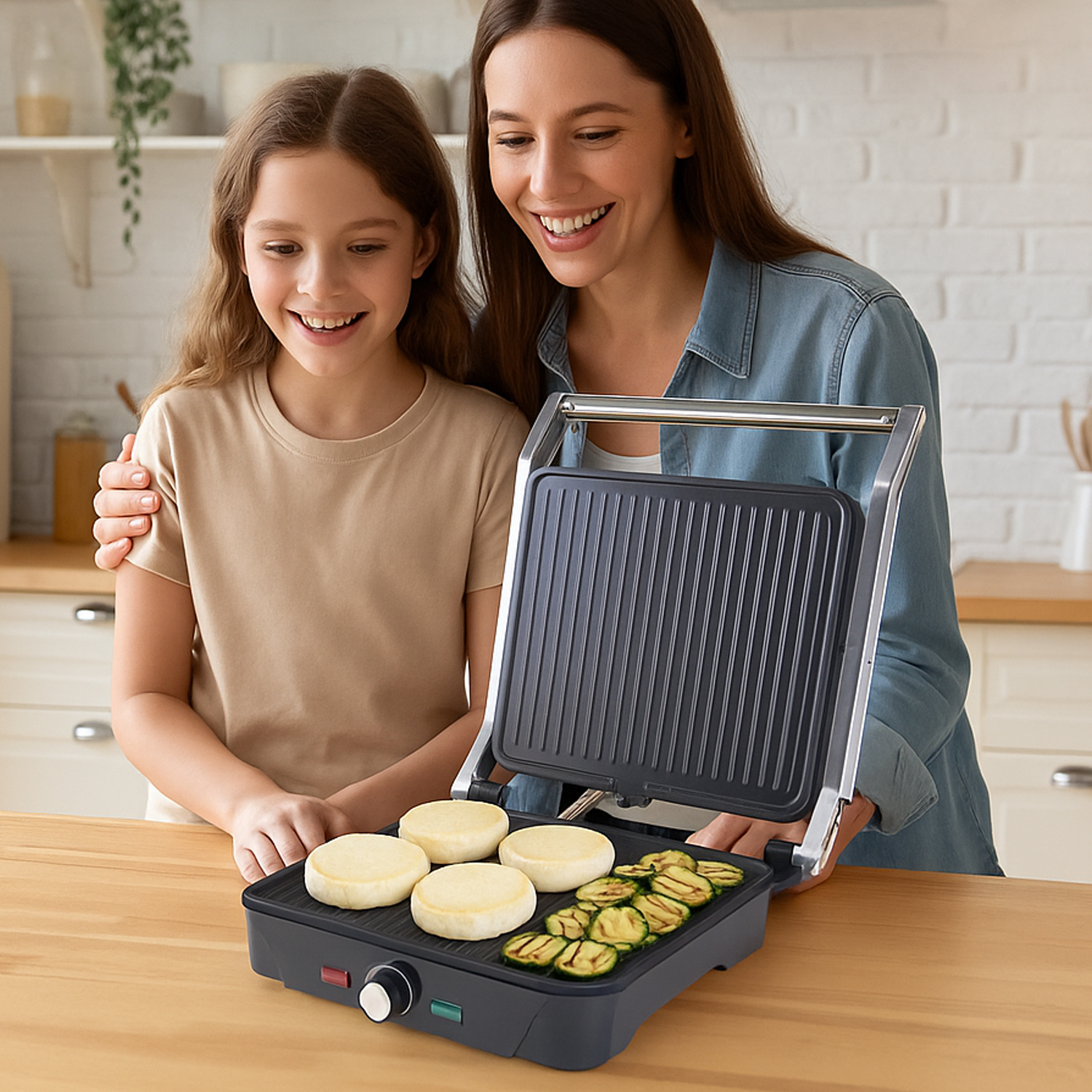 - PIASTRE IN ALLUMINIO PRESSOFUSO ANTIADERENTE: Le piastre della griglia elettrica Grand Grill assicurano una cottura omogenea e una pulizia veloce, senza attaccare gli alimenti.