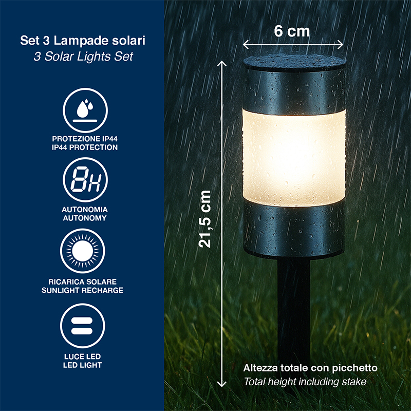 - SET DI 3 LAMPADE SOLARI DA GIARDINO: Le luci solari da esterno si ricaricano con l’energia del sole e garantiscono un’illuminazione pratica ed ecologica per giardini, vialetti e cortili.