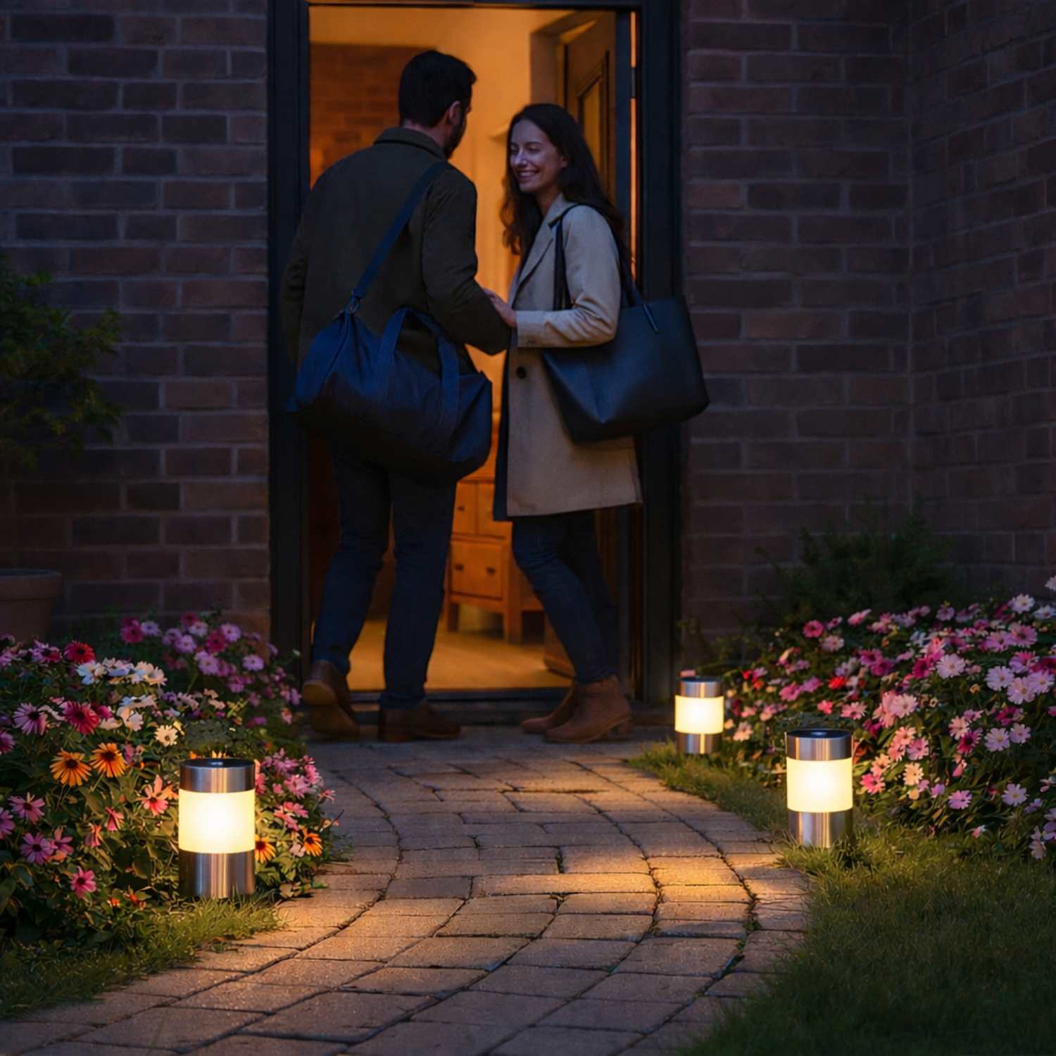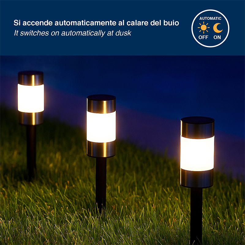 - ACCENSIONE AUTOMATICA CREPUSCOLARE: Le lampade solari segnapassi si accendono automaticamente al buio e si spengono con la luce del giorno, senza bisogno di interruttori o cavi.