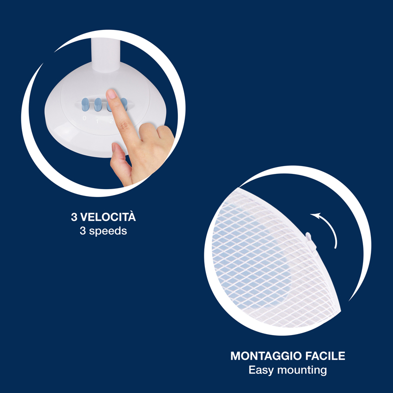 • VELOCITA' REGOLABILEE: Le 3 velocità sono selezionabili dal pannello di controllo posto sulla base a seconda del flusso d’aria desiderato. Ideale per rinfrescarsi con eleganza.